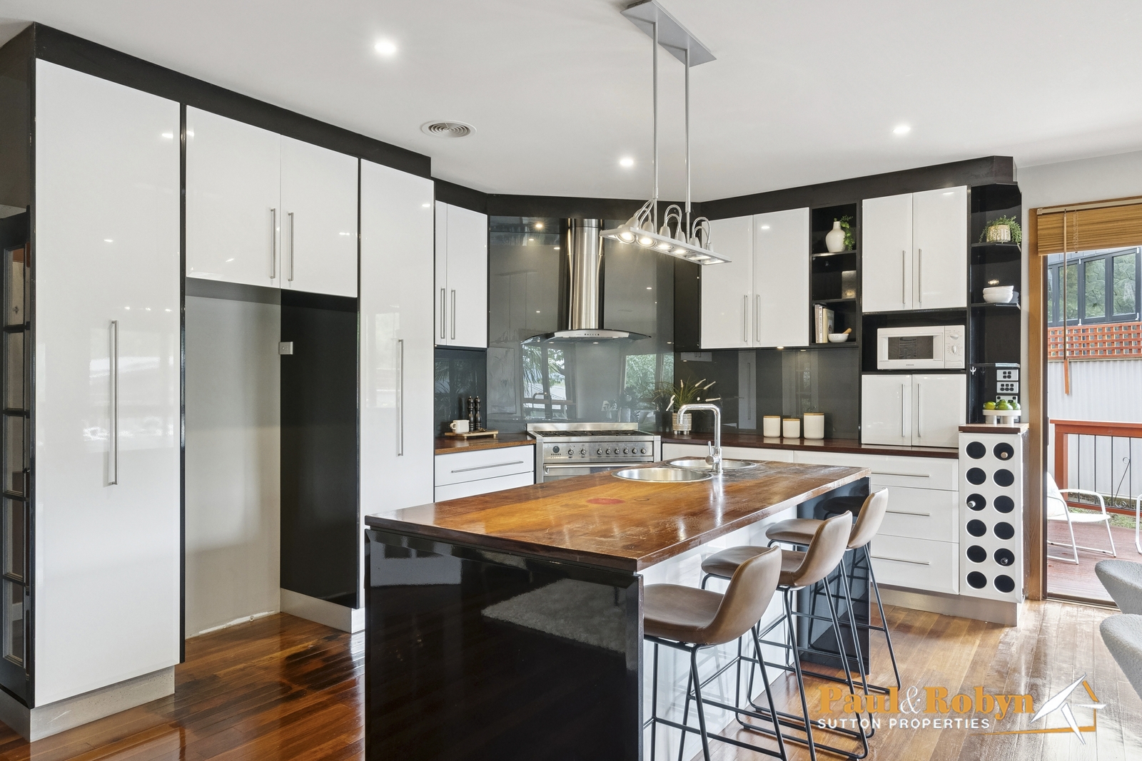 The kitchen is a standout: sleek, contemporary and highly functional, featuring Jarrah benchtops, glass splashbacks, a 900mm stainless steel gas oven and thoughtfully designed storage including pull‑out pantries. It’s a space equally suited to quiet mornings or hosting friends over long lunches.